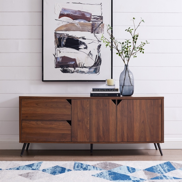 Walker edison modern storage fireplace console, 60 inch, dark walnut. Desdemona sideboard with 3 drawers, bleached elm. Tate walnut 64.5 media console with 2 wide bookcases. 69w x 15.75d x 24h. Putting an industrial spin on the farmhouse design trend this media console features open and closed storage thats framed with exposed metal accents on the sides and top corners of the piece.